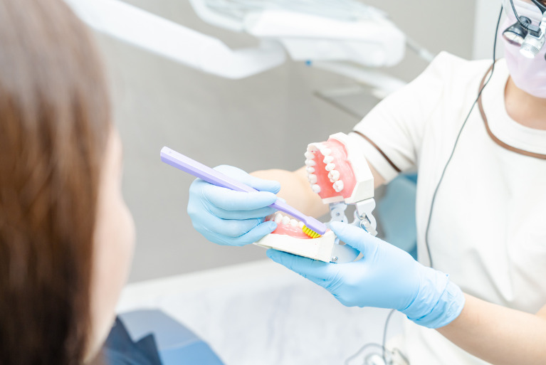 予防治療では、毎日のブラッシングが非常に重要です。患者さまの歯並びにあったブラッシング方法を指導して磨き残しを防ぎます。歯ブラシの選び方や歯間ブラシ・デンタルフロスの使い方や選び方もアドバイスします。